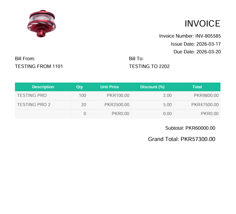 Upload Logo: Invoice Number: Issue Date: Due Date: Bill From: Bill To: Description Quantity Unit Price Dis (%) Total Action 0.00 X Add Product Currency: USD ($) PKR (₨) Pound (£) INR (₹) Subtotal: 0.00 Grand Total: 0.00 Generate PDF Reset